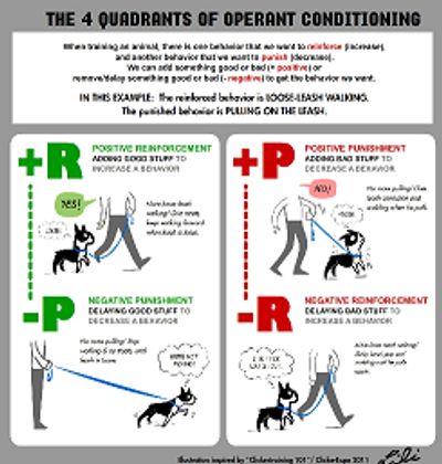 My training style is based upon a branch of psychology known as operant conditioning. Operant conditioning encourages desired behavior with reinforcement, and discourages undesirable behavior with "punishment". (I prefer to use the term correction, since I not only let the dog know it is doing something wrong, I also show it the correct response or behavior that I am looking for.) Put another way, it associates a voluntary action ─ be it good or bad ─ with a consequence . As Master Dog Trainer Drake Parker of Top Dog Academy in Greenville, NC is wont to say, "Never deny a dog the consequences of its actions."